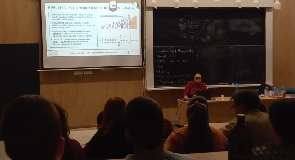 On 10.03.2025., our team member, Bojana Stanic have given the popular talk on “Forever chemicals” to the students of the Faculty of Sciences University of Novi Sad. She discussed what classifies certain chemicals as “Forever chemicals”, what are PFAS, where they can be found, how dangerous they are to human health and what scientists around the world, including us at the ToxIN project, are doing to get to know them better.